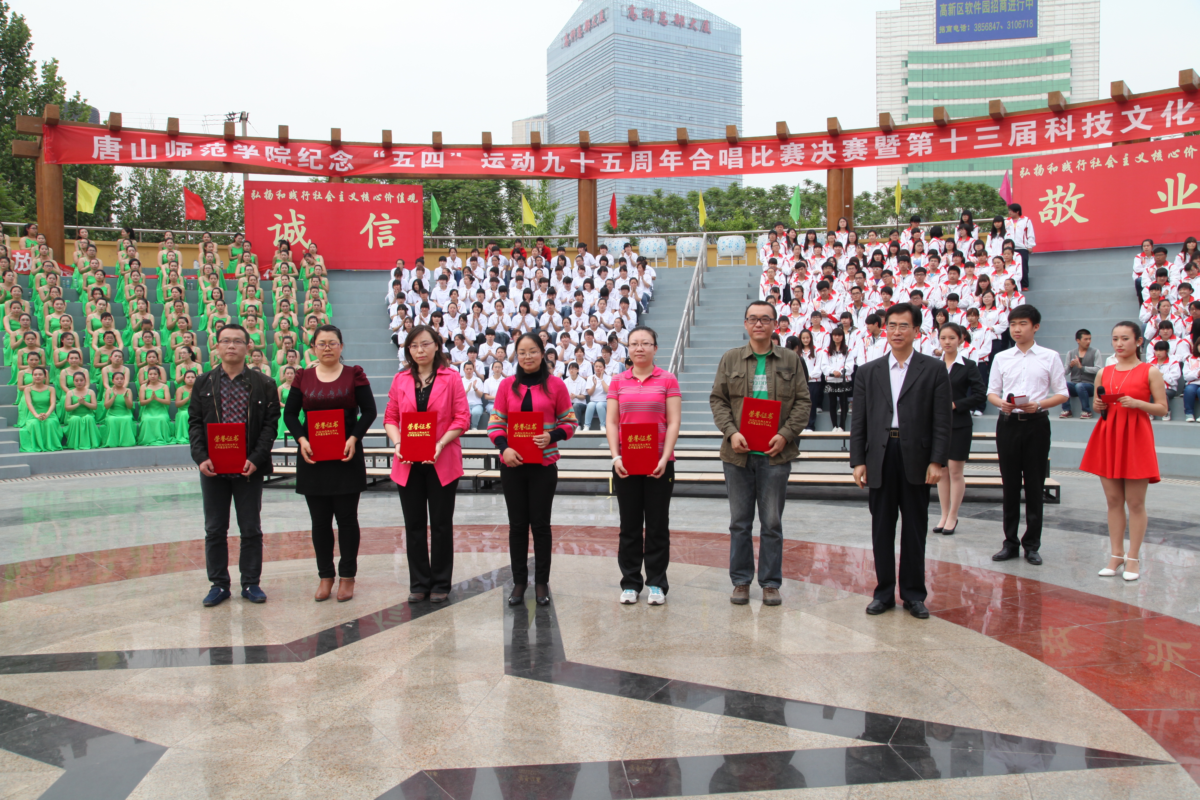 在纪念五四运动95周年之际,为让师院学子传承发扬五四爱国精神,弘扬践行社会主义核心价值观, 5月6日,由校团委主办、大学生艺术团承办的纪念五四运动95周年合唱比赛决赛暨第13届科技文化艺术节开幕式在行知广场举行。校党委书记李卫中,院长范永胜,党委副书记赵剑锋,副院长阎满富、杜彩芹、孙立军、客绍英和相关职能部门领导以及各系党总支书记、副书记、团总支书记出席了本次活动。
