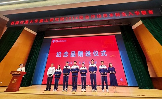 唐山研究院院长吴刚、纪委书记梁思颖向新生代表赠予入学礼物——定制书签,其上镌刻西南交大校徽,它将承载着殷切期望,伴随学子们走过不同寻常的学习之旅,砥砺前行。