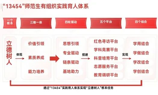 学院坚持以学生为中心,注重学生创新能力和综合素养的培养,将第一课堂与第二课堂有机融合,构建了“13454”有组织实践育人体系:坚持“一个根本”,立德树人根本任务;体现“三维一体”育人目标,价值引领、素质养成、能力培养;通过“四轮驱动”,思想引领、专业驱动、链条驱动、基地助力;搭建“五个平台”,即红色寻访平台、学科竞赛平台、科普培育平台、志愿服务平台和教育调研平台;实现“四个结合”,即学用结合、学做结合、学改结合、学创结合。在推动第一课堂、第二课堂相互贯通、协同发力,实现实践育人组织化、专业化、品牌化的同时,青年学生在实践中政治认同感、社会责任感、职业道德、职业核心素养和能力得到了有效提高,助力学生全面发展。