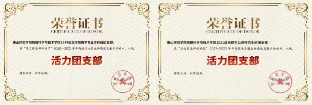 学院涌现出2个全国高校活力团支部。其中,2021级物理学公费师范生团支部“最具贡献度”全国排名TOP4。2人被评为“中国大学生自强之星”,其中,张哲源同学受到了共青团中央的关注和赞扬,并被邀请担任共青团中央“青年大学习”网上团课第七季第八期主持人。2019年12月16日“建设社会治理共同体”的专题团课在唐山录制完成并上线,全国1700多万名团员关注观看,被共青团中央、河北共青团和搜狐等多家媒体报道。