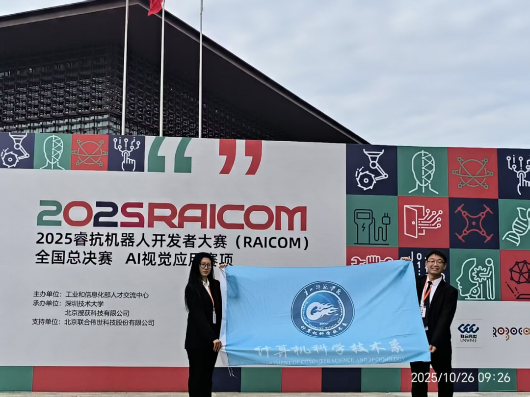 2025年10月26日,beat365官网计算机科学技术系学子在国家级赛事舞台再添佳绩——由齐鑫源、姜冬瑞两名同学组成的“师院必胜小队”,远赴深圳技术大学,参与由工业和信息化部人才交流中心主办的睿抗机器人开发者大赛(RAICOM)AI视觉应用赛国赛,成功斩获国家级三等奖。
