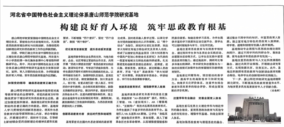 4.注重开发富有地方和学校特色的教学案例,开展了中学教学案例库建设。通过河北省大中小学思政课一体化集体备课中心,联合唐山市大中小学,构建技术赋能、生动活泼、地域文化特色鲜明、师生共同参与的思政课教学案例库。已经初步形成李大钊精神、抗震精神、习近平总书记在河北重大实践和视察河北重要讲话指示等教学案例,运用到大中小学思政课建设中,成效显著。编写《李大钊与新中国》等系列唐山本土红色文化校本教材和教学案例库,围绕大中小学思政课一体化建设、红色文化育人等开展教学研究,获批国家社科基金项目2项,教育部产学研合作项目2项,河北省高校教育教学改革研究项目6项,出版学术专著10部,出版教材3部,发表学术论文数十篇。“构建良好育人环境 筑牢思政教育根基”思政课建设经验在《光明日报》刊登宣介。