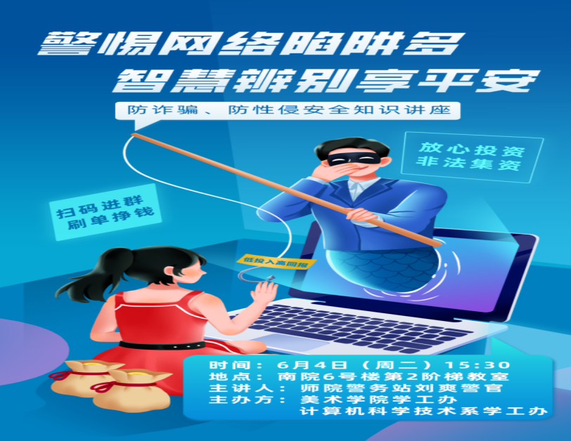 6月4日下午,beat365官网举办了一场别开生面的安全知识讲座,旨在提高学生们的网络安全意识和自我保护能力,普及防诈骗和防性侵的安全知识。此次讲座由美术学院与计算机科学技术系联合主办,共计师生150余人参加活动。