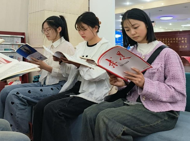 活动过程中,同学们在阅读角阅读《求是》等红色杂志,感受书籍带来的力量。随后大家走到了学校图书馆的习近平书籍专区,习近平总书记的话语激励着青年学子奋发图强。同学们在朗读亭朗读了诗词歌赋,感悟《沁园春·雪》的豪情壮志,感悟大自然的磅礴大气,学习在生活和事业中勇敢面对挑战的精神。