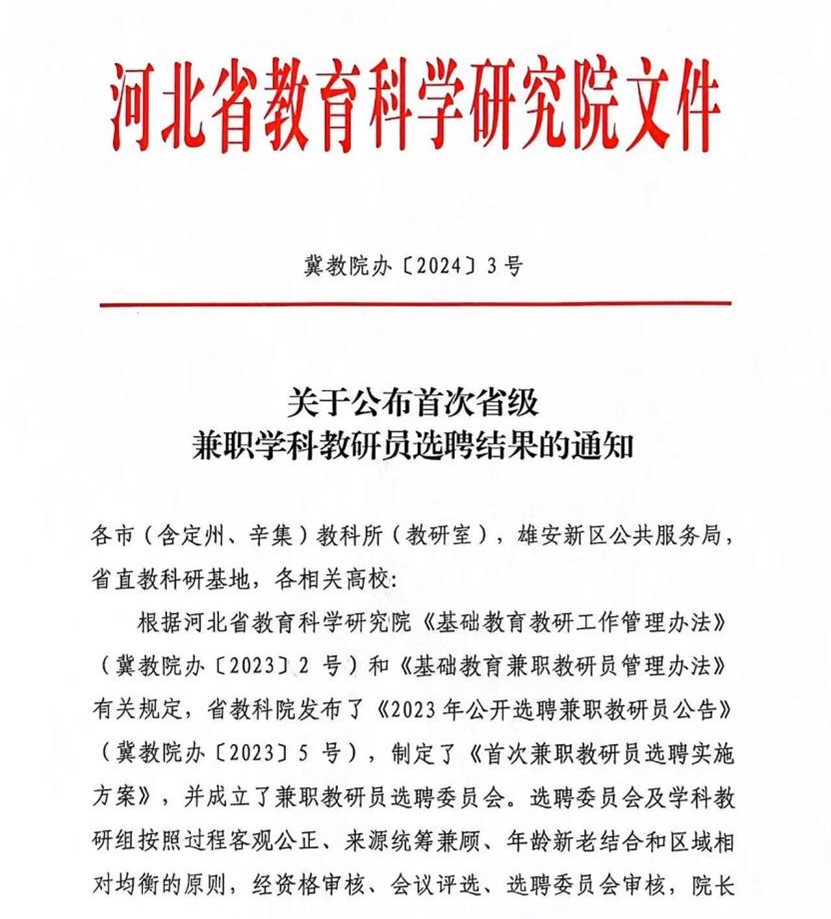 2023年底,河北省教科院根据有关文件进行兼职教研员选聘,这是河北省首次选聘省级兼职学科教研员。beat365官网教师朱立明博士凭借着优秀的教研能力通过兼职教研员选聘委员会的选拔,被评选为河北省小学数学兼职学科教研员,试用期满且经学科教研组集体认定可以正常履行省级兼职学科教研员工作职责的,予以颁发省级兼职学科教研员聘书。