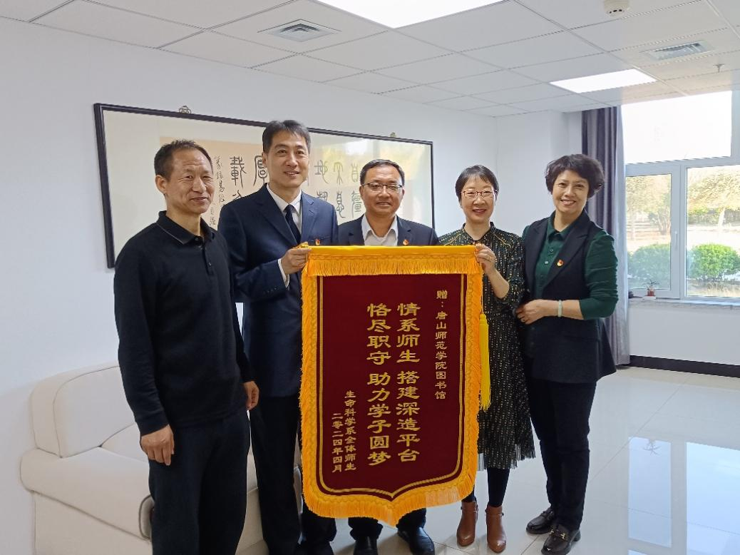 4月16日,生命科学系主任蔡玉梅、副主任范永山代表全系师生给图书馆送来了一份特殊的礼物——一面绣有“情系师生,搭建深造平台;恪尽职守,助力学子圆梦”的锦旗,图书馆郑向群书记、丁新龙馆长和周进良副馆长接过了锦旗。这面锦旗不仅是对图书馆提供优质服务的肯定,更是对图书馆在考研学子们求学道路上给予帮助的深深感谢。