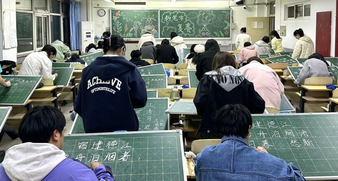 参赛学生纷纷屏气凝神,执笔端正,全神贯注,将身心融于笔端,每一笔、每一划都彰显出严谨的态度和师范生专业素养。同学们按照规定的时间,书写传统古诗词,尽情挥洒三寸粉笔。一幅幅书法作品不断在黑板上呈现出来,笔笔显功力,字字显神韵。