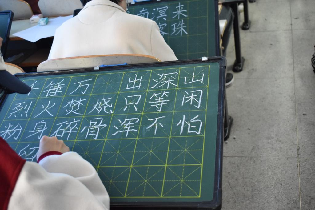 本次比赛分为硬笔书法和粉笔书法两部分,需要参赛同学进行现场书写,由评委老师们进行打分评比。同学们专心致志,一丝不苟。书写结束后,评委们对作品进行反复斟酌,优中选优。一幅幅作品字形挺拔,笔画流畅;藏锋出锋,收放自如,书写出了汉字的豪气与潇洒。