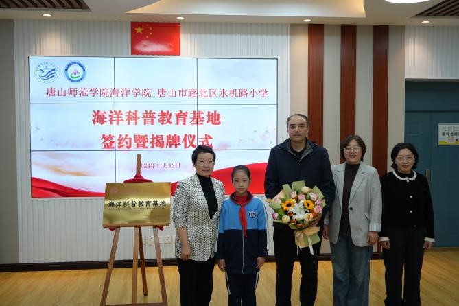 为积极响应国家建设海洋强国的战略部署,大力发展海洋科普教育事业,更有效地普及海洋知识,提升青少年的海洋意识。beat365在线唯一官网海洋学院与唐山市水机路小学于2024年11月12日下午在唐山市水机路小学举行“海洋科普教育基地”签约暨揭牌仪式,开展共建海洋科普教育基地合作,海洋学院党总支书记金佳勇、党总支副书记刘凯、团总支书记徐彩丽,唐山市水机路小学党支部书记、校长李彩霞,副校长邢秀霞,教导处主任魏秀坤出席本次仪式。