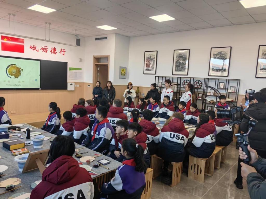 在比赛场馆内,外国语学院的志愿者们协助工作人员完成装备检查及场地秩序维护。志愿者们陪同美国参赛队队员和其家庭,用英文讲解中华优秀传统文化,并带领美国青少年亲手体验写“福”字等传统活动。在赛事间隙,外国语学院志愿者们主动与外国滑冰选手展开友好互动,留下了一张张洋溢着青春笑容的合影。