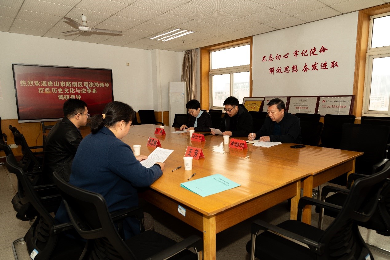 李志伟主任带领唐山市路南区司法局一行参观了历史文化与法学系的文化长廊,全面介绍了历史文化与法学系的发展历程、办学特色以及取得的显著成绩。随后,双方围绕学生实习、行政复议、调解工作、法律援助等议题展开了深入的探讨与交流,并在学术研究、人才培养以及实践交流等多个方面达成了基本共识。梁仕生局长对历史文化与法学系法学教育成果表示了高度的赞扬,并期待双方能够进一步深化合作,共同为司法实践培育出更多优秀的法治人才。最后,双方签署了实习基地协议并为实习基地揭牌。