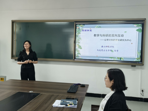 讲座中,赵雪博士指出:“教学是科研选题的灵感,科研是教学的有力支撑。”赵雪博士以党的先驱人物李大钊的相关研究为核心,阐释在理论研究的基础上,教师如何进一步打破学科壁垒、深化学科间的融合,并借助技术手段提升效率,构建“科研引导教学、教学反哺科研”的可持续发展教学路径。最后以李大钊先生的话勉励现场师生:凡事都要脚踏实地去作,不驰于空想,不骛于虚声,而唯以求真的态度作踏实的工夫。以此态度求学,则真理可明,以此态度作事,则功业可就。
