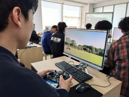 在模拟器训练室,企业教练指导学生操作无人机飞行模拟系统。讲解技术实践与安全科普,帮助学生理解无人机操作中的风险防控要点。