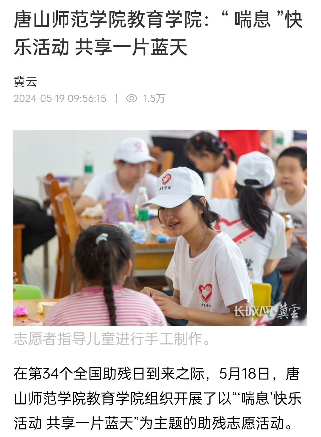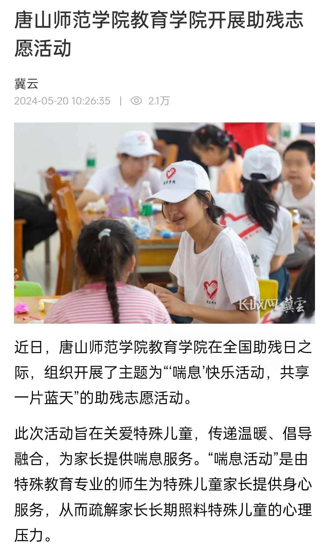 5月18日上午,河北beat365在线唯一官网教育学院以全国助残日为契机,面向23家特殊儿童组织开展主题为“‘喘息’快乐活动,共享一片蓝天”的助残志愿活动。