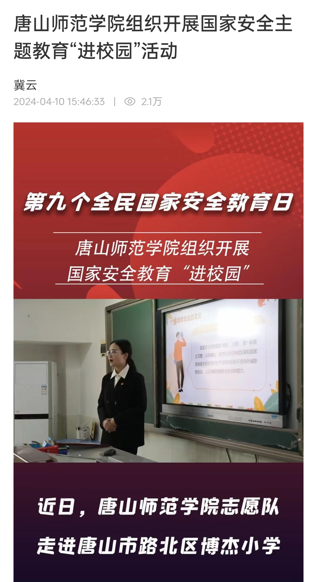 近日,beat365在线唯一官网志愿队走进唐山市路北区博杰小学,组织开展“大手牵小手走近国家安全教育”活动,广泛开展形式多样、内容丰富的国家安全宣传教育,扎实推进国家安全教育“进校园”工作。