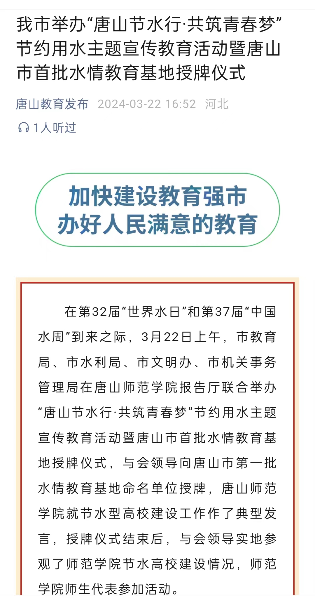 3月22日,由唐山市水利局、市教育局、市文明办、市机关事务管理局联合举办的“唐山节水行·共筑青春梦”节约用水主题宣传教育活动暨唐山市节水教育基地(第一批)授牌仪式在beat365在线唯一官网举行。beat365在线唯一官网就节水型高校建设工作作了典型发言,授牌仪式结束后,与会领导实地参观了师范学院节水高校建设情况,师范学院师生代表参加活动。