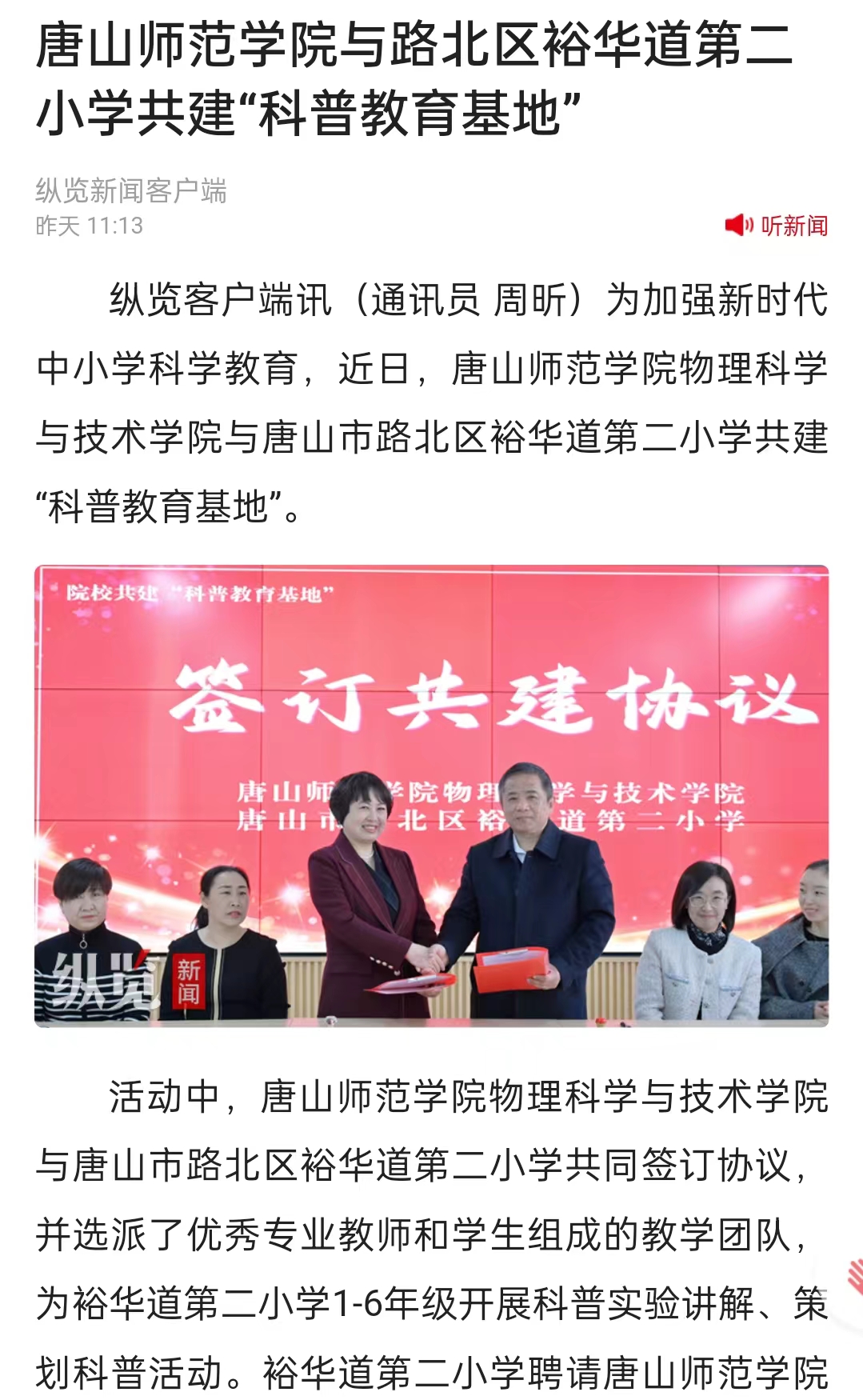 近日,beat365在线唯一官网物理科学与技术学院与唐山市路北区裕华道第二小学共建“科普教育基地”。
