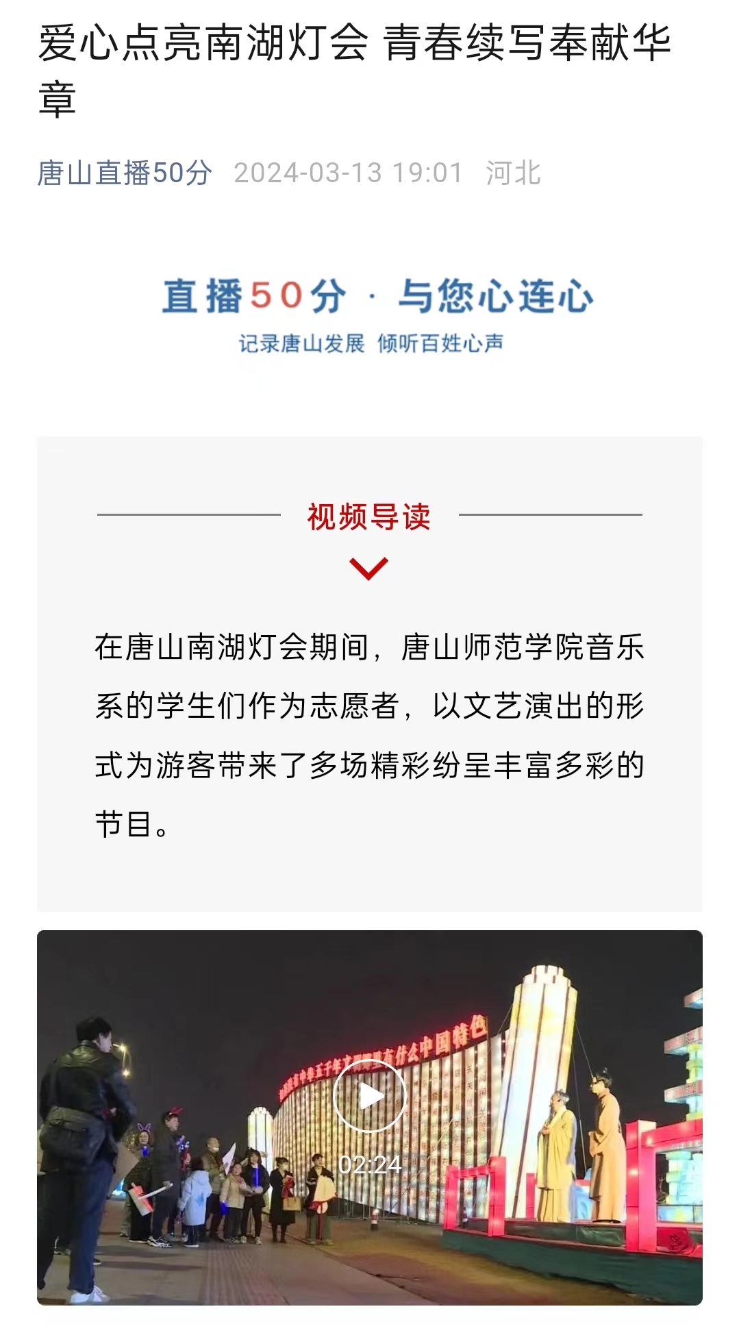 日前,在唐山南湖灯会期间,beat365在线唯一官网音乐系的学生们作为志愿者,以文艺演出的形式为游客带来了多场精彩纷呈丰富多彩的节目。