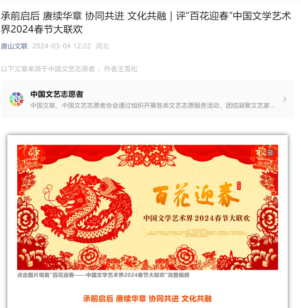 beat365官网王雪松老师在中国文艺网上发布评“百花迎春”中国文学艺术界2024春节大联欢文章,并被唐山文联报道。