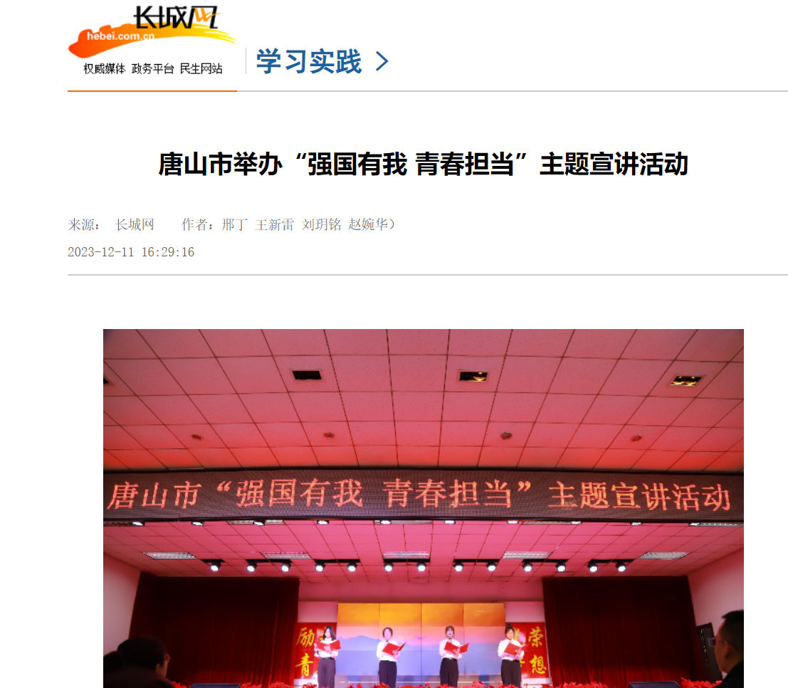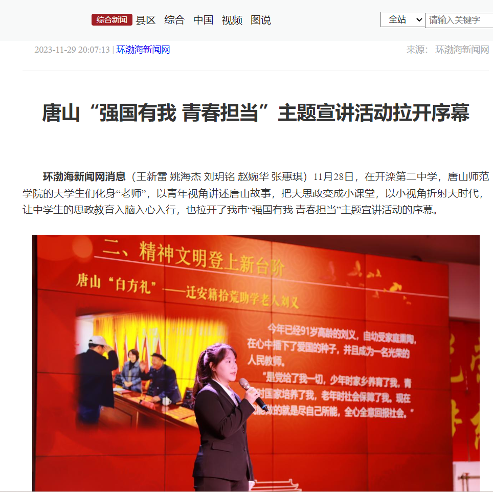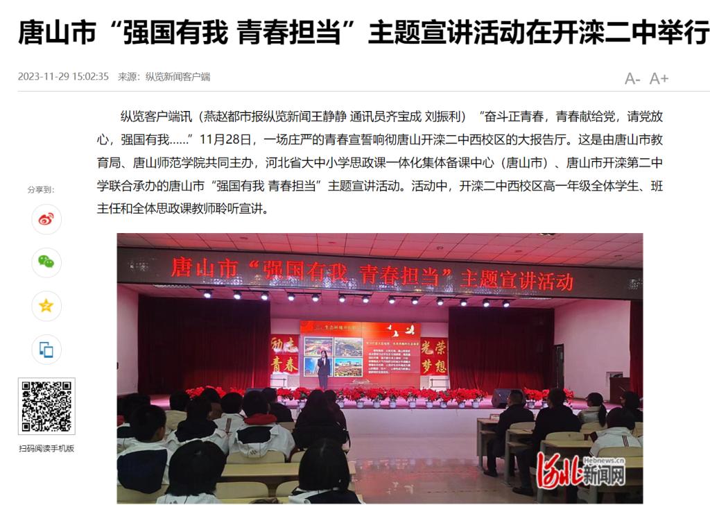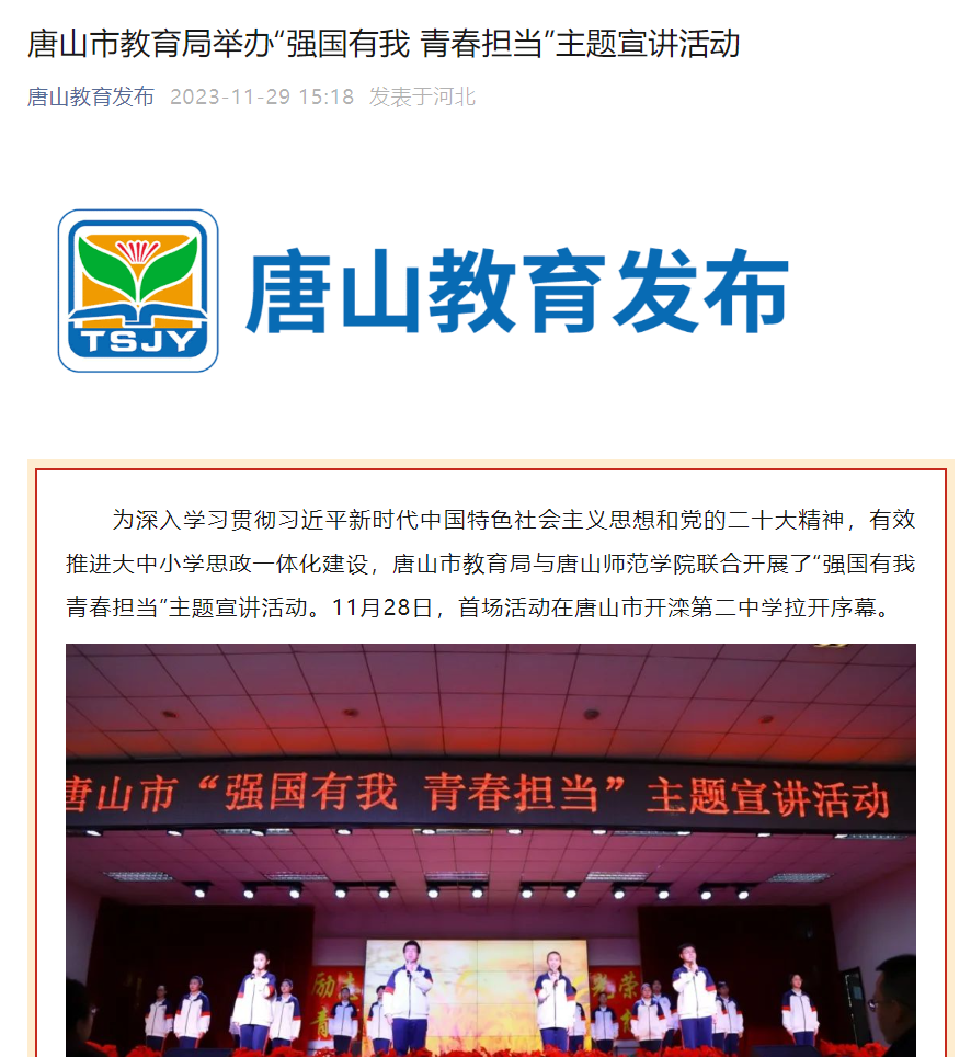 为深入学习贯彻习近平新时代中国特色社会主义思想和党的二十大精神,有效推进大中小学思政一体化建设,唐山市教育局与beat365在线唯一官网联合开展了“强国有我 青春担当”主题宣讲活动。11月28日,首场活动在唐山市开滦第二中学拉开序幕。该活动已被唐山广播电视台、唐山教育发布报道。