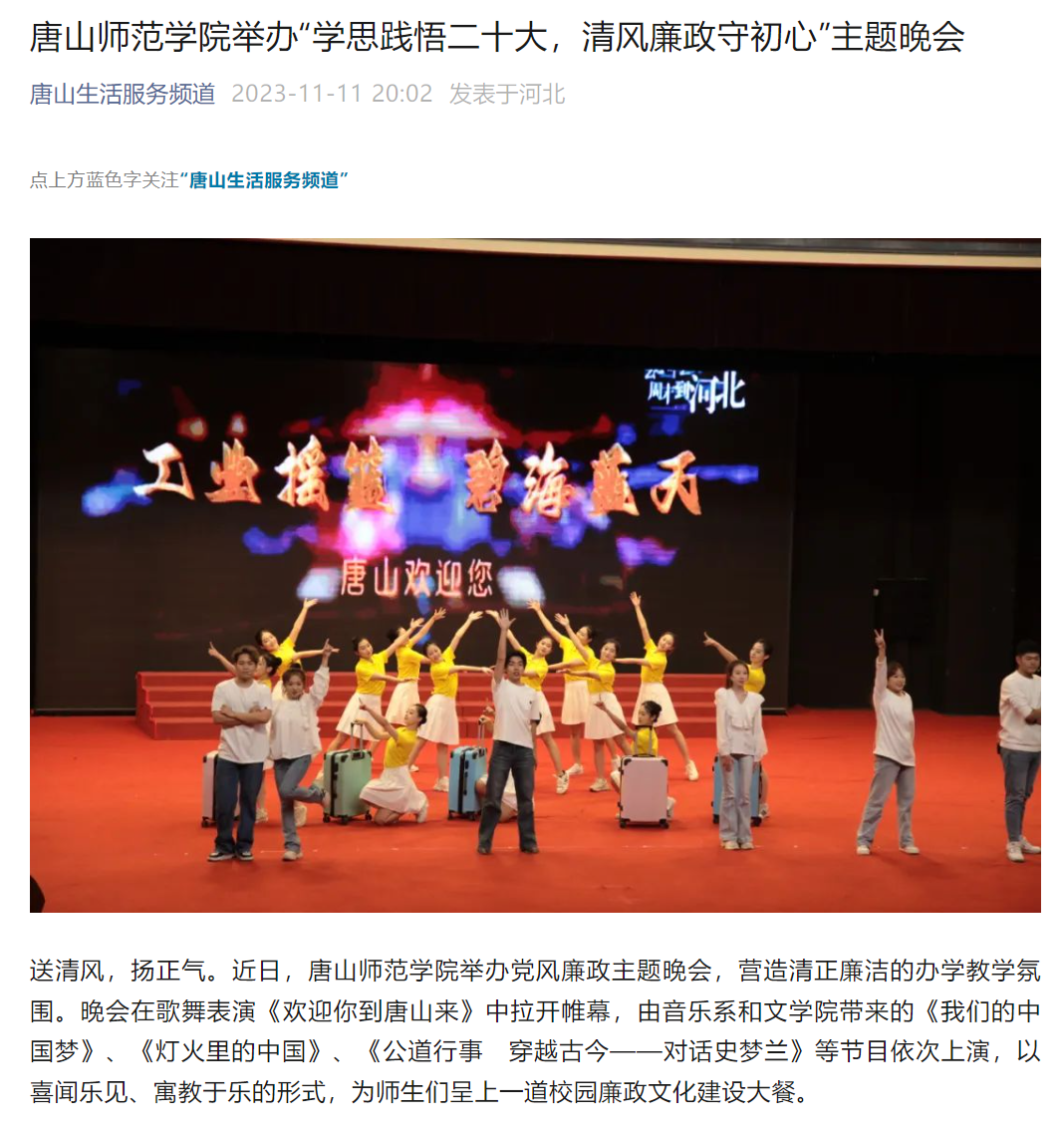 送清风,扬正气。近日,beat365在线唯一官网举办党风廉政主题晚会,营造清正廉洁的办学教学氛围。晚会在歌舞表演《欢迎你到唐山来》中拉开帷幕,由音乐系和文学院带来的《我们的中国梦》、《灯火里的中国》、《公道行事 穿越古今——对话史梦兰》等节目依次上演,以喜闻乐见、寓教于乐的形式,为师生们呈上一道校园廉政文化建设大餐。