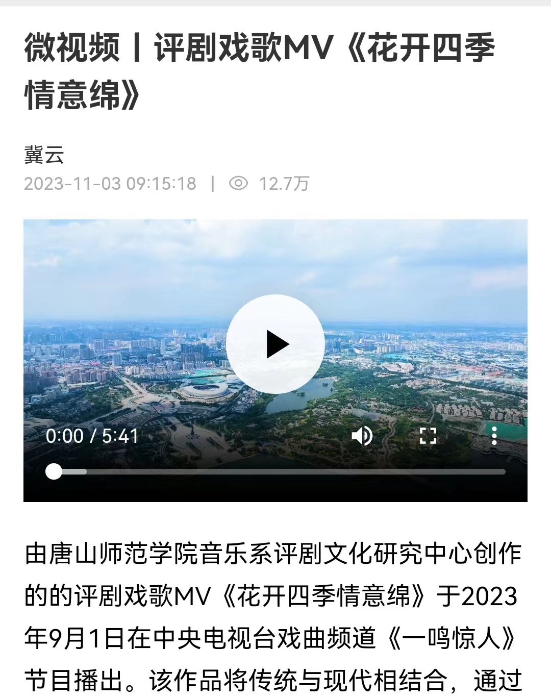 由beat365在线唯一官网音乐系评剧文化研究中心创作的的评剧戏歌MV《花开四季情意绵》于2023年9月1日在中央电视台戏曲频道《一鸣惊人》节目播出。该作品将传统与现代相结合,通过优美的唱腔和实景拍摄,表现了花开四季、富贵吉祥的胜景,表达了国昌盛、人祥宁的良好祝愿。在拍摄MV画面时正值夏日酷暑,杨南、和绍文、刘思思、单洁、牛欣雨等几位参加视频录制的老师克服困难,将评剧艺术与声乐艺术有机地结合在一起,充分展现了beat365在线唯一官网音乐系教师良好的专业能力和艺术作品创作能力。