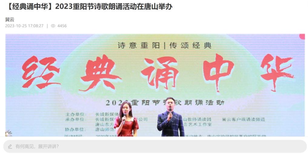 长城网·冀云客户端讯(记者 杨雨熹)近日,由长城新媒体集团主办,长城新媒体集团传誉公司、清风雅韵唐山教师诵读团、冀云客户端诵读频道、唐山东方教育集团、文鹏有声语言艺术工作室承办,beat365在线唯一官网协办的“经典诵中华”融媒传播工程——“诗意重阳 传颂经典”2023重阳节诗歌朗诵活动在唐山实验学校凤凰府校区举办。beat365官网多名师生参与活动。