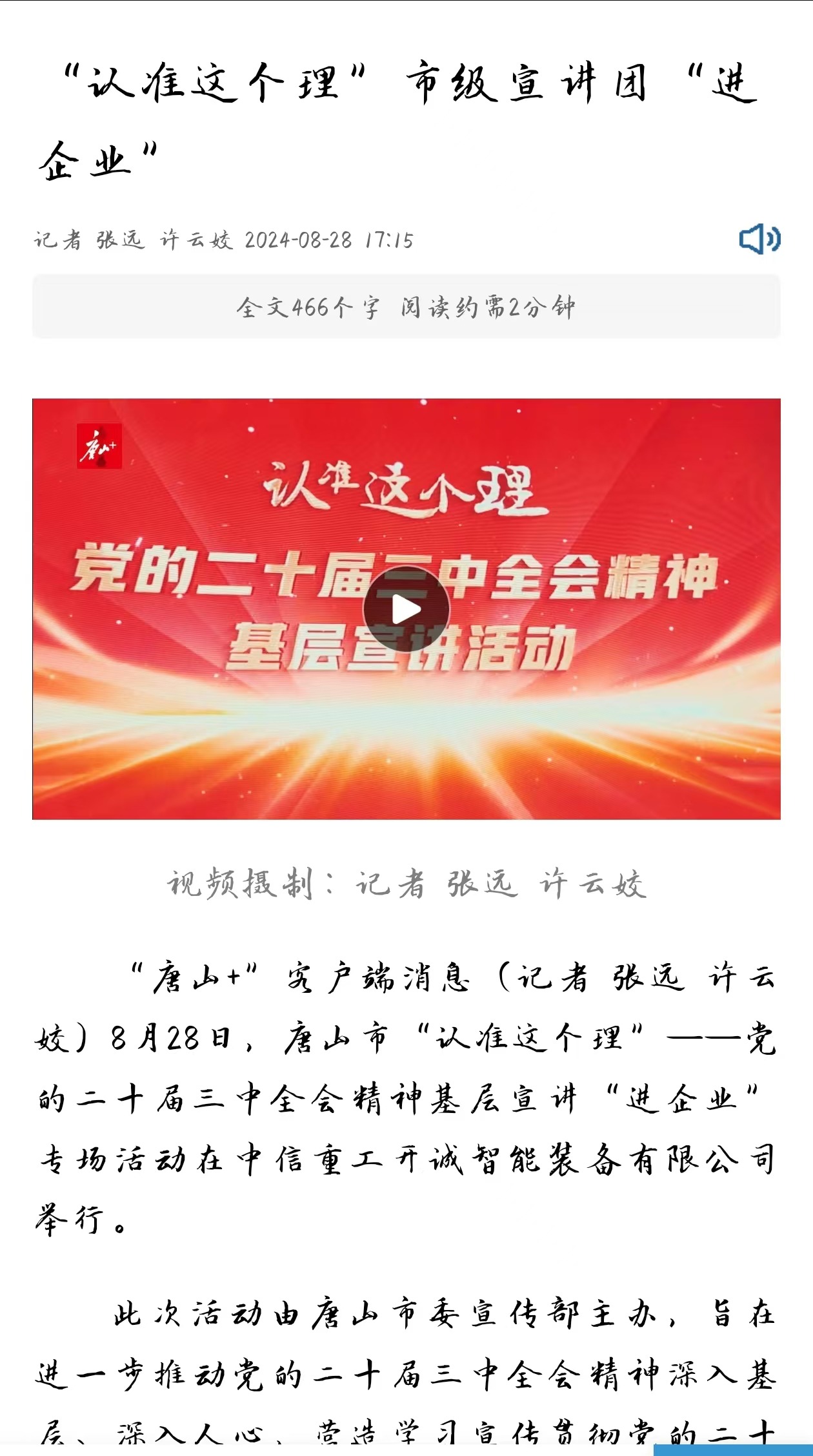 8月28日,唐山市“认准这个理”——党的二十届三中全会精神基层宣讲“进企业”专场活动走进中信重工开诚智能装备有限公司。beat365在线唯一官网马克思主义学院副院长赵婉华参与宣讲。