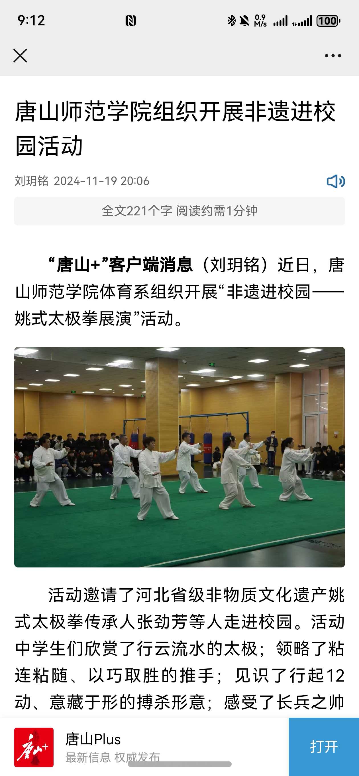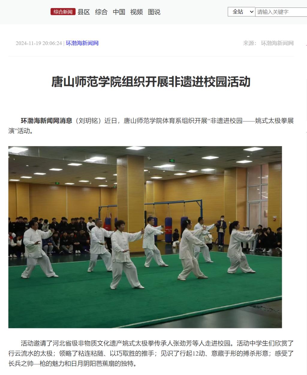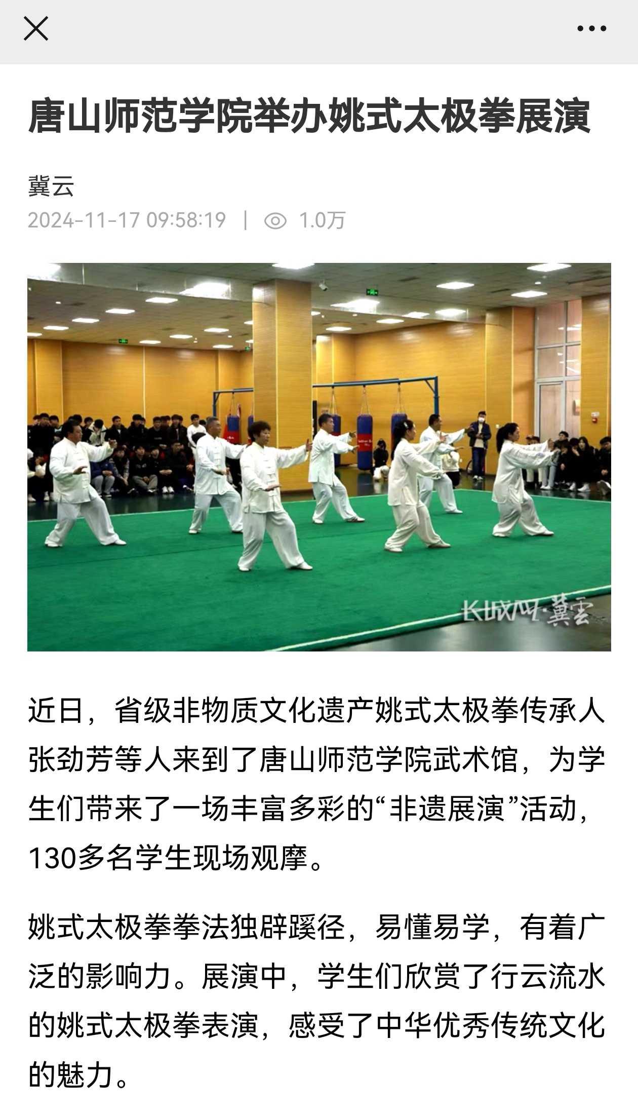 近日,省级非物质文化遗产姚式太极拳传承人张劲芳等人来到了beat365在线唯一官网武术馆,为学生们带来了一场丰富多彩的“非遗展演”活动,130多名学生现场观摩。