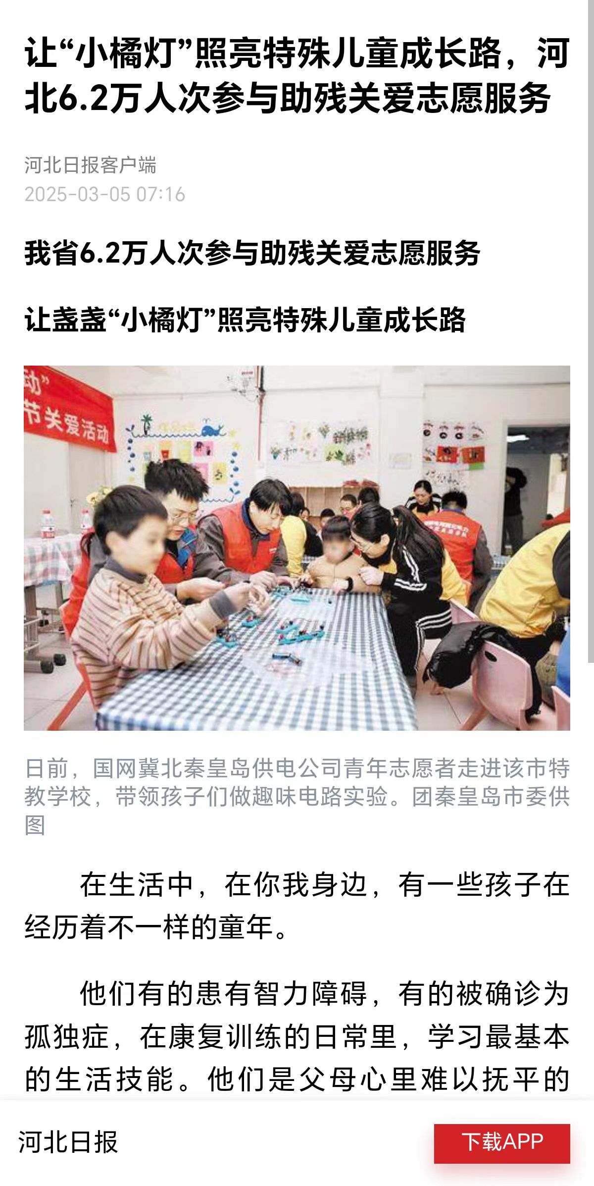 2023年7月,团省委启动"小橘灯"助残接力计划,目前全省共有6.2万人次志愿者参与其中,让盏盏"小橘灯"照亮特殊儿童成长路。