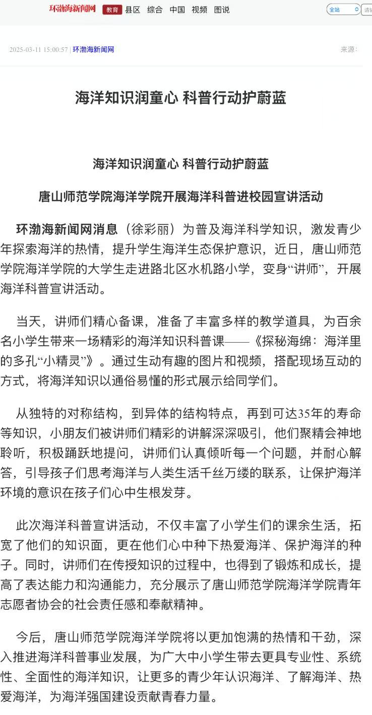 3月4日,beat365在线唯一官网海洋学院走进唐山市水机路小学,开展海洋科普宣讲活动。