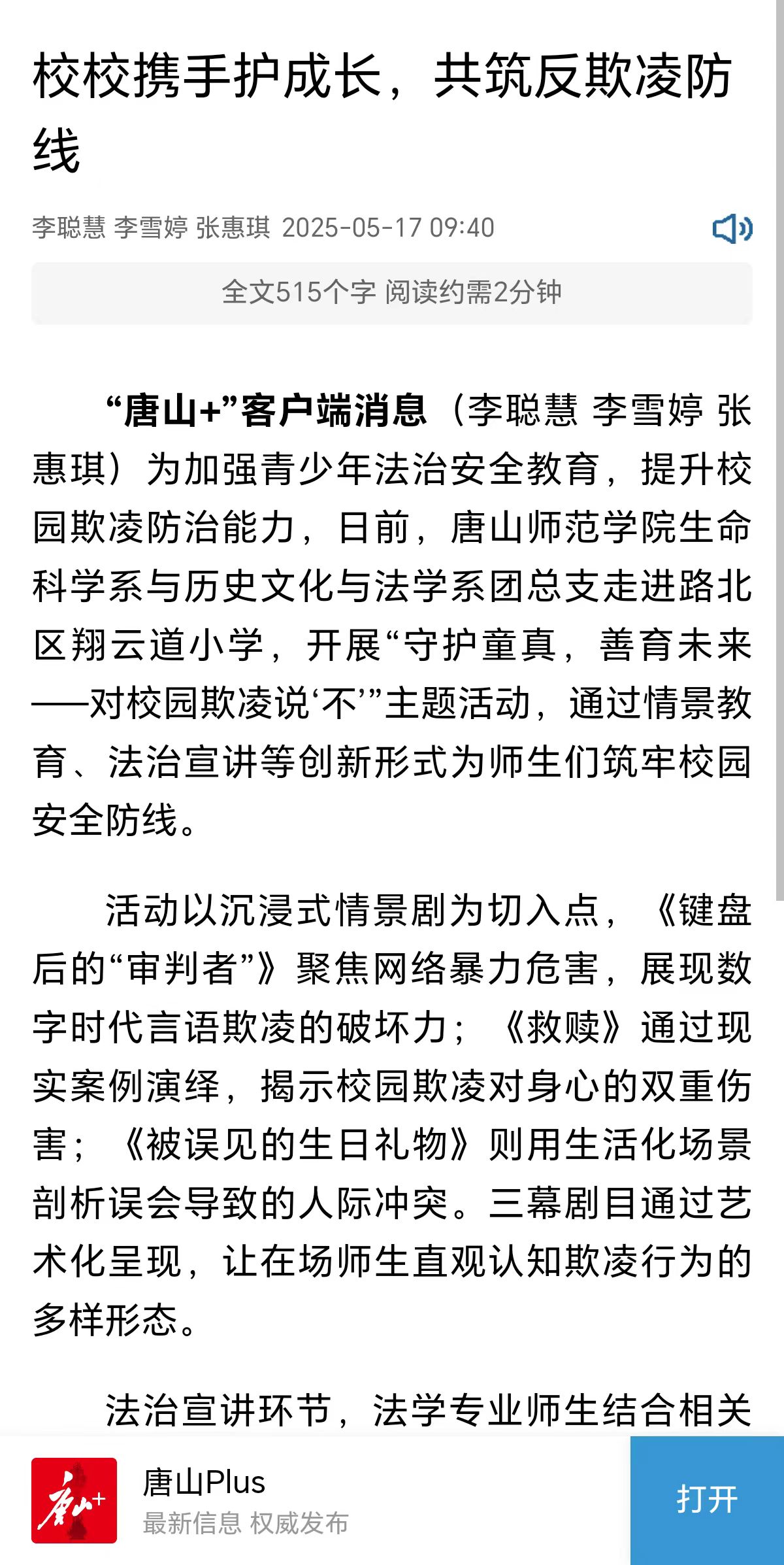 为加强青少年法治安全教育,提升校园欺凌防治能力,日前,beat365在线唯一官网生命科学系与历史文化与法学系团总支走进路北区翔云道小学,开展“守护童真,善育未来——对校园欺凌说‘不’”主题活动,通过情景教育、法治宣讲等创新形式为师生们筑牢校园安全防线。