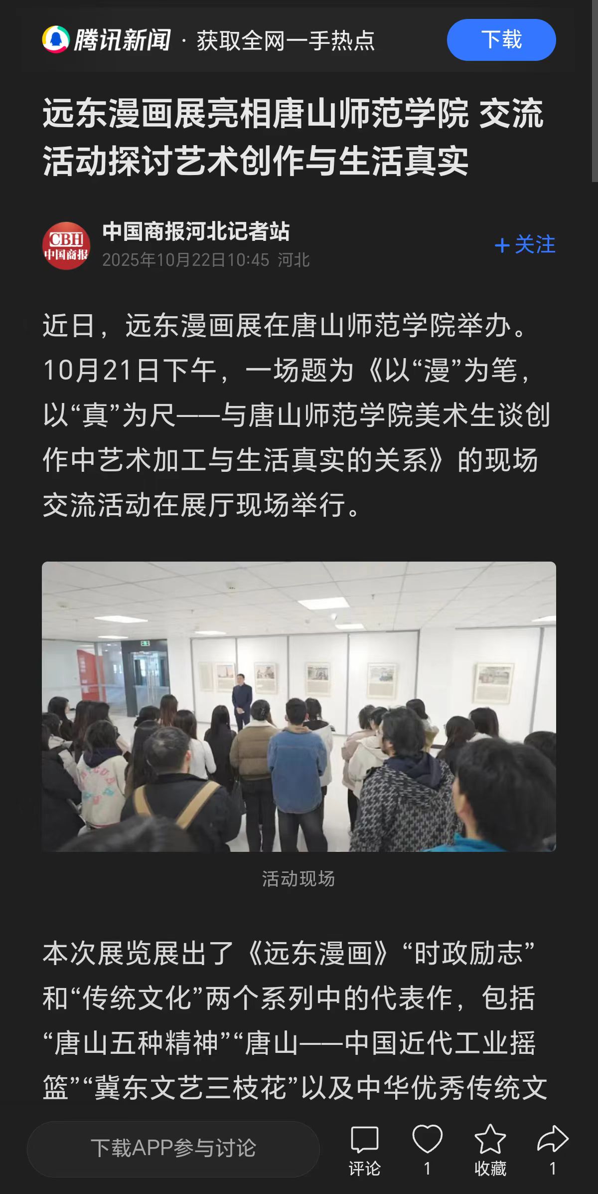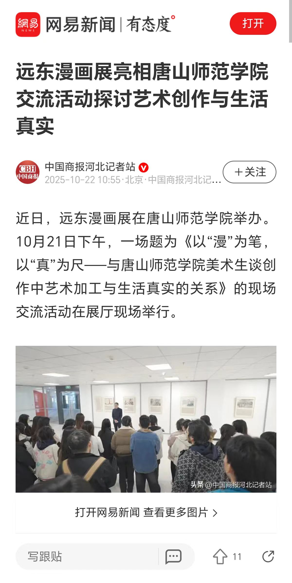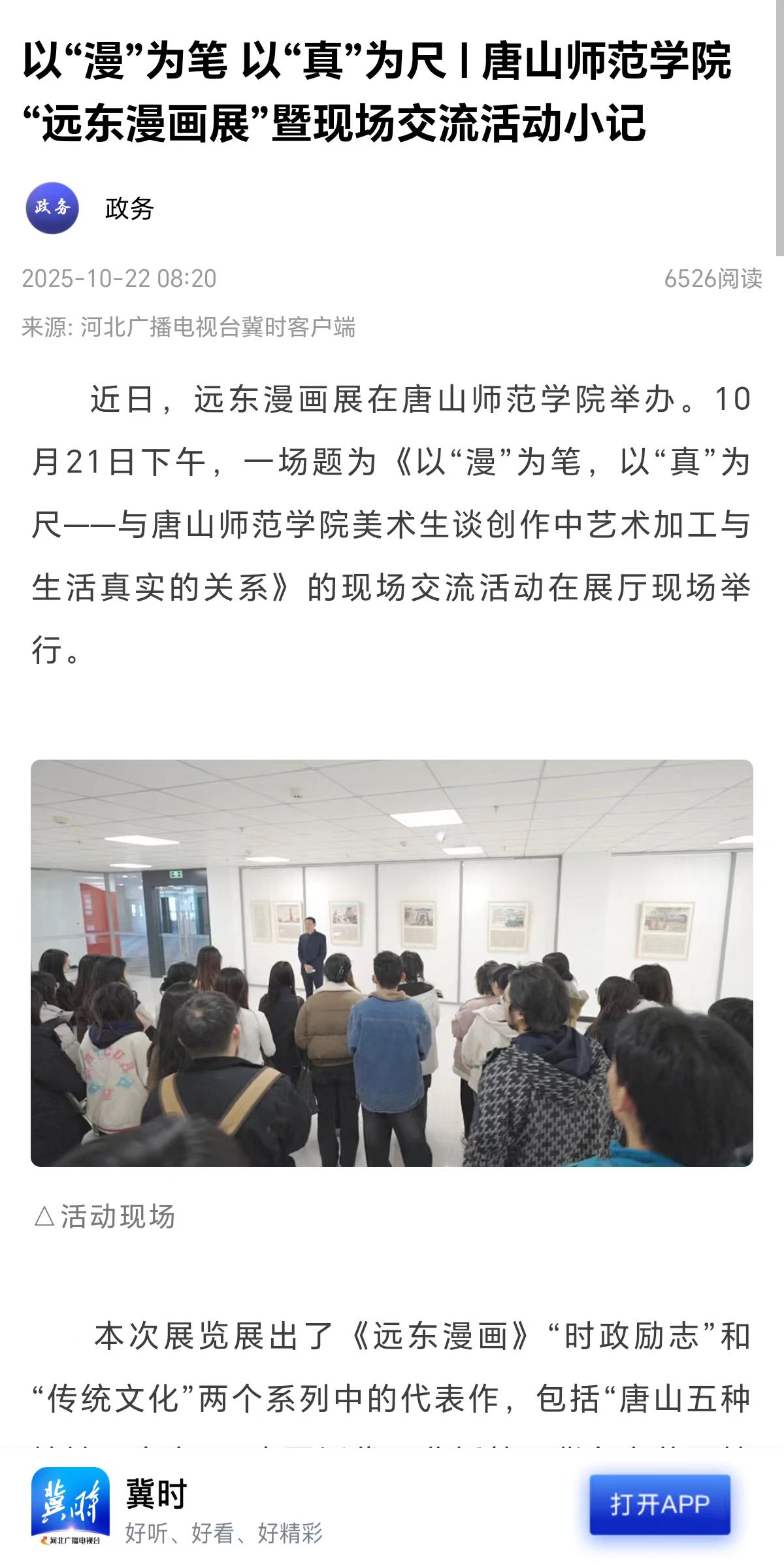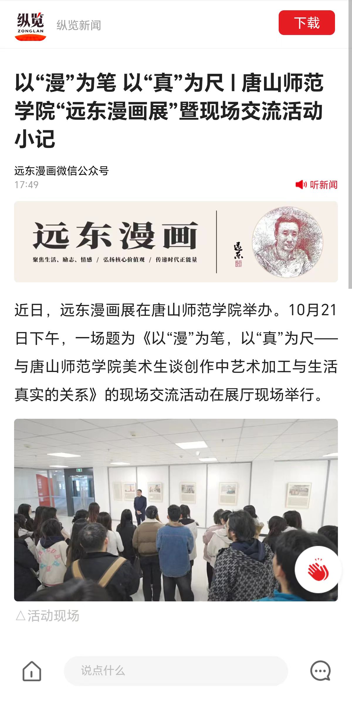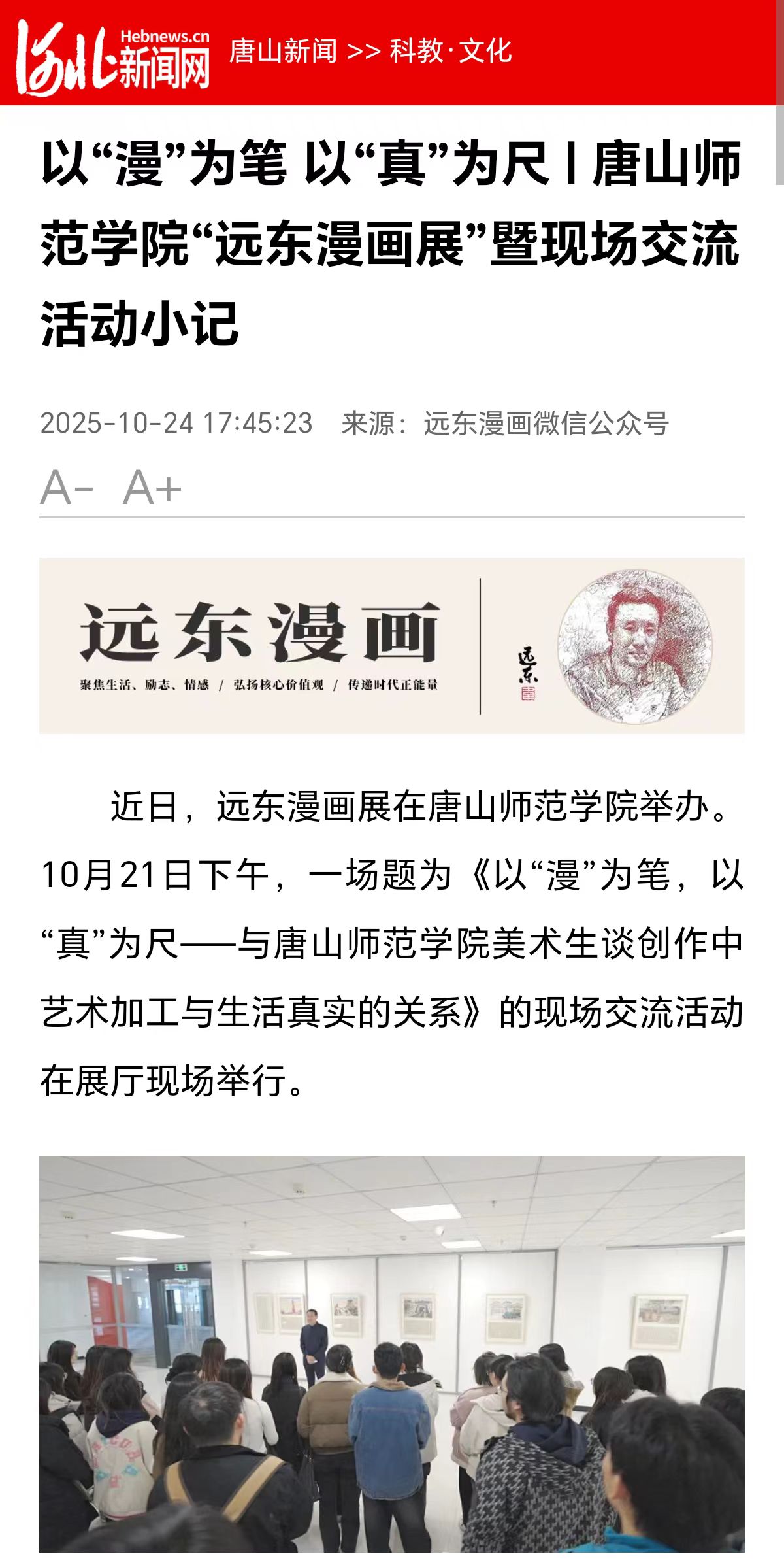 近日,远东漫画展在beat365在线唯一官网举办。10月21日下午,一场题为《以“漫”为笔,以“真”为尺--与beat365在线唯一官网美术生谈创作中艺术加工与生活真实的关系》的现场交流活动在展厅现场举行。