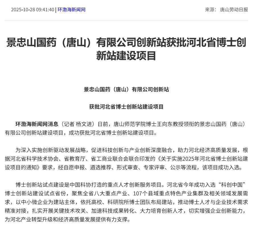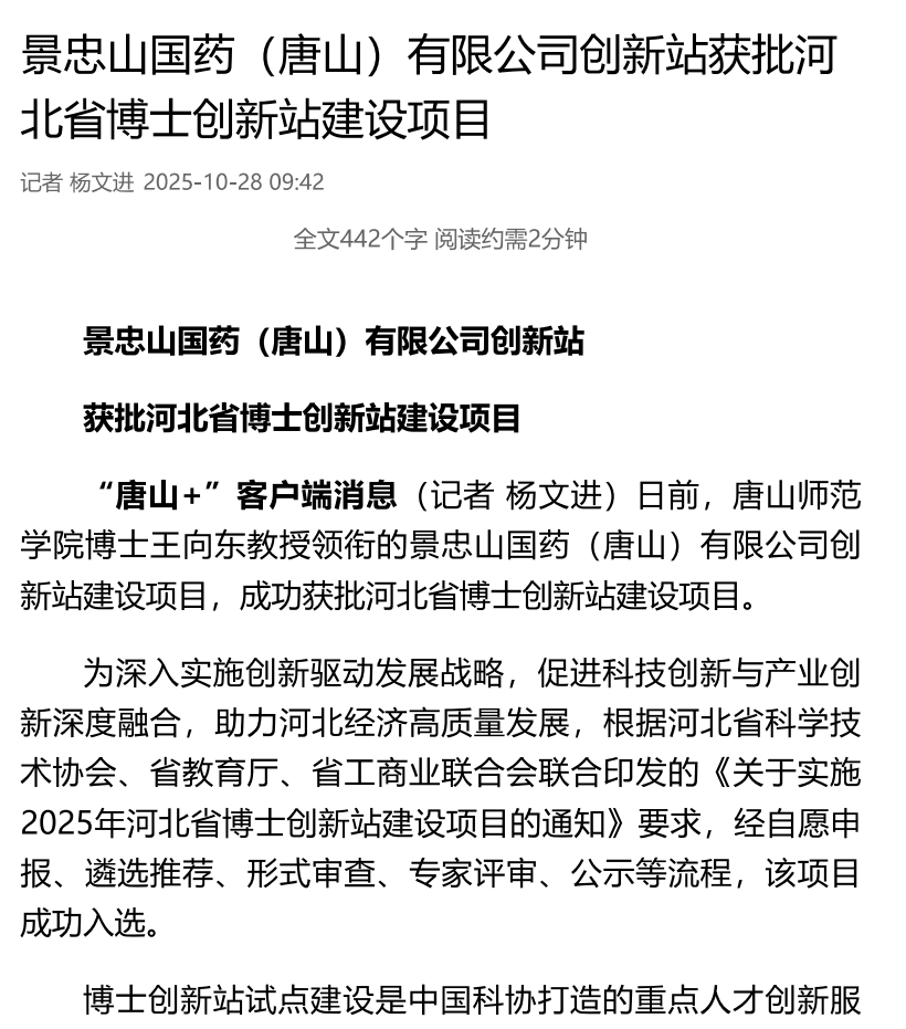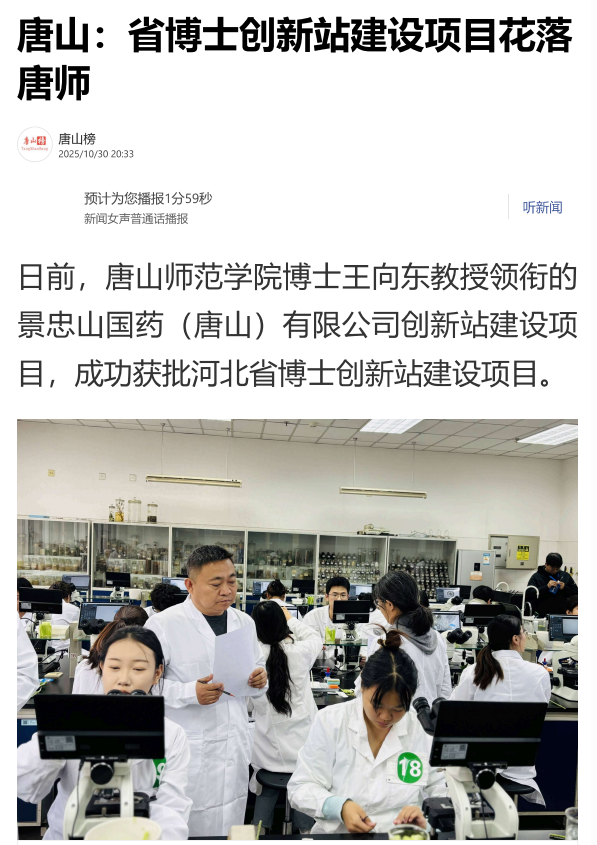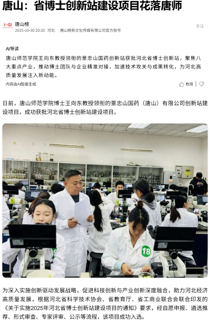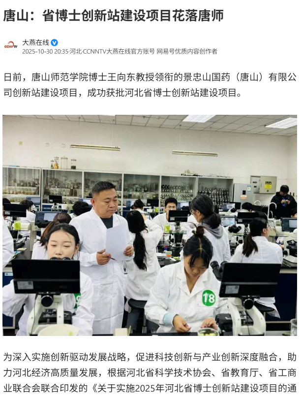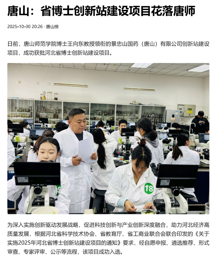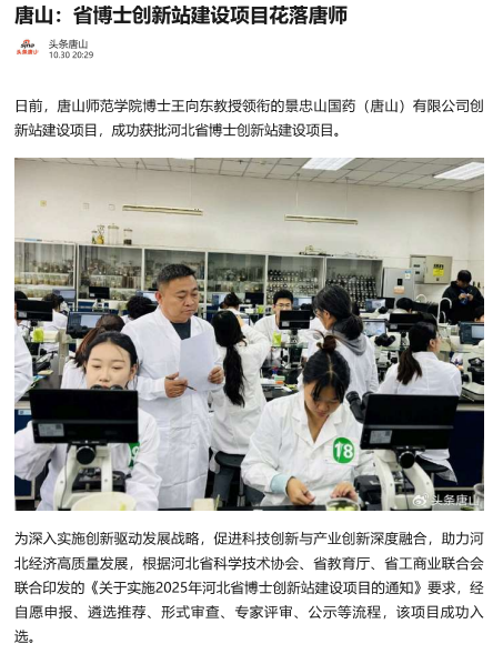 beat365在线唯一官网博士王向东教授领衔的景忠山国药(唐山)有限公司创新站建设项目,成功获批河北省博士创新站建设项目。
