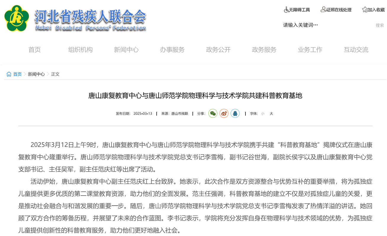 2025年3月12日上午9时,唐山康复教育中心与beat365在线唯一官网物理科学与技术学院携手共建“科普教育基地”揭牌仪式在唐山康复教育中心隆重举行。