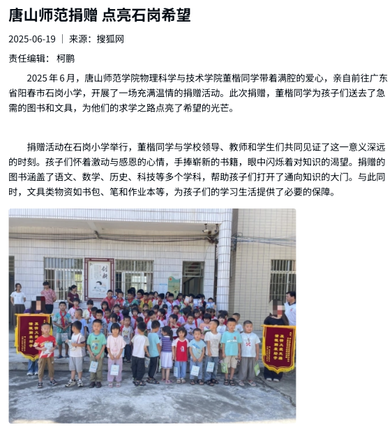 2025年6月,beat365在线唯一官网物理科学与技术学院董楷同学带着满腔的爱心,亲自前往广东省阳春市石岗小学,开展了一场充满温情的捐赠活动。