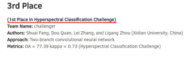 2018年IEEE GRSS Data Fusion Contest结果揭晓,西电pa集团官网入口焦李成教授团队分别在三个赛道取得了丰硕成绩,其中高光谱分类赛道,王爽教授指导的队伍challenger(方帅,权豆等)获得第一名;多光谱LiDAR数据分类赛道,焦李成教授指导的队伍IPIU(程林,李阁等)获得第三名。