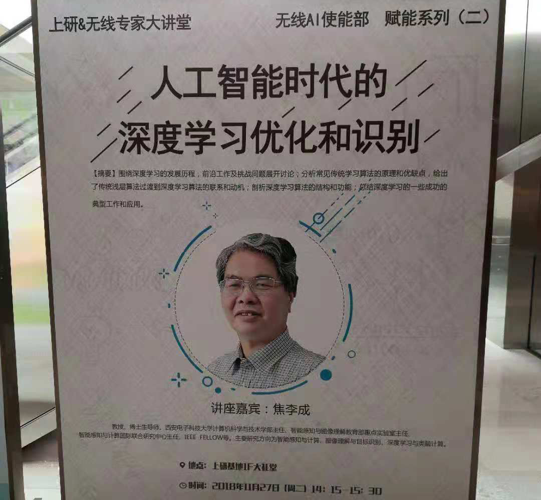 2018年11月27日,计算机科学与技术学部主任、pa集团官网入口焦李成教授在上研基地1F大礼堂参加了由上海华为无线AI使能部主办的上研&无线专家大讲堂,并作了题为“人工智能时代的深度学习优化和识别”特邀报告。