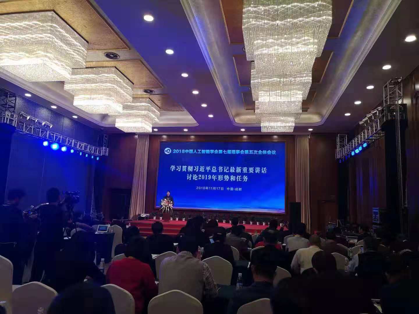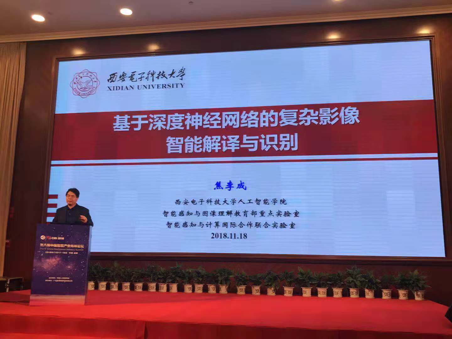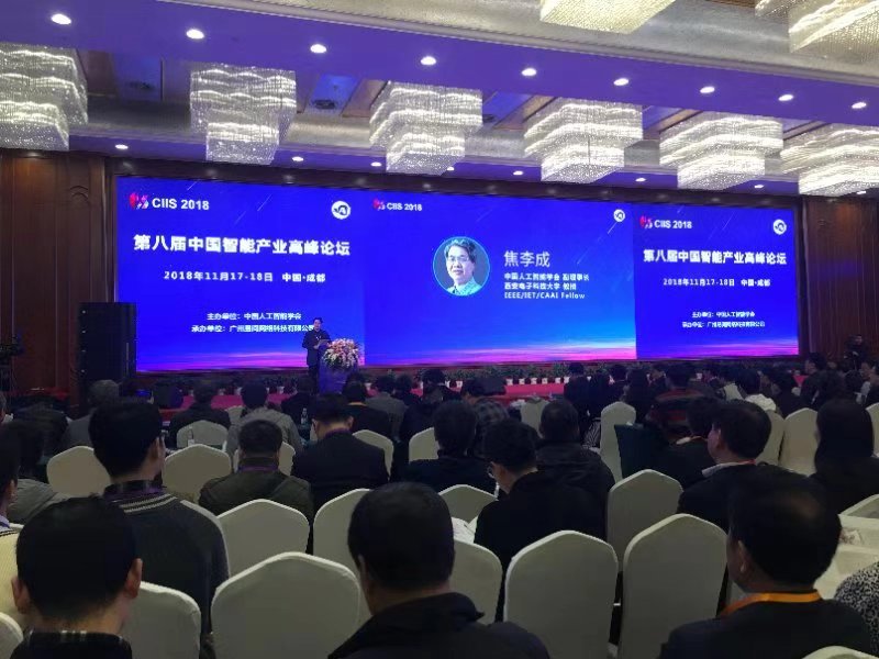 2018年11月17日,pa集团官网入口焦李成、侯彪等一行10人在成都参加了由中国人工智能学会主办的2018第八届中国智能产业高峰论坛,焦李成教授作为主持人主持大会。