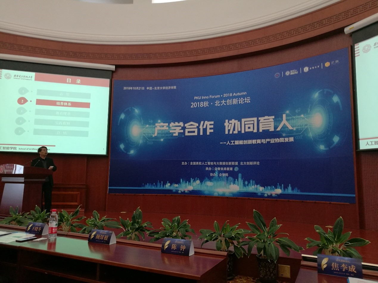 2018年10月21日,计算机科学与技术学部主任,pa集团官网入口焦李成教授受邀参加了由全国高校人工智能与大数据创新联盟主办的“产学合作 协同育人”2018全国高校人工智能与大数据教育教学创新论坛暨北大创新评论峰会,并做了题为“人工智能国际化创新人才的培养与实践”学术报告。